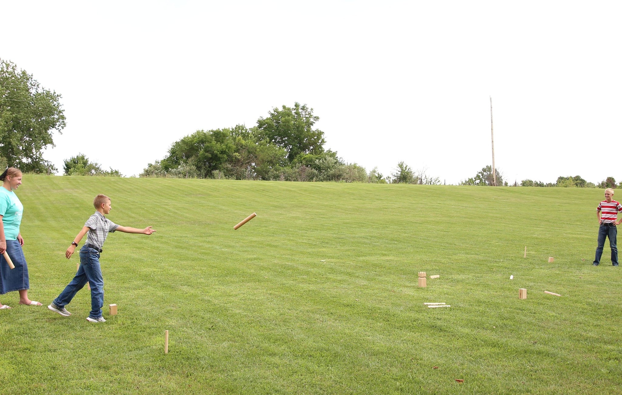 In 2004, we were introduced to the game of Kubb (pronounced "koob") by our friends at Bald Eagle Boys Camp in Pennsylvania. Since then, Kubb has quickly become one of our favorite family yard games. Also called "Viking Chess", Kubb originated on the island of Gotland in Sweden. It is quickly gaining popularity in the United States because of its wonderful mix of throwing skill, strategy, and luck. It has been compared to "Horseshoes, Bocce, and Cornhole all rolled into one great game". Kubb is easy to learn to play and can be played with 2-12 players to accommodate large or small groups. Our Kubb Games are made in Holmes County, Ohio by our Amish friends. Each Deluxe Kubb Game Set is made out of Maple Hardwood harvested in the Appalachians. Each piece is made out of solid Hard Maple wood. Hard Maple wood is one of the hardest woods available. We only use solid pieces of wood in our Kubb Games, no glued together pieces like cheaper sets. Our Kubb Games are Official Size according to the U.S. National Kubb Championship Rules. The King is 10" high x 3 1/4" wide, the Kubbs are 5 15/16" high x 2 3/4" wide, and the Batons are 11 7/8" long x 1 3/4" diameter. The Kubb Set includes 1 King, 10 Kubbs, 6 Throwing Batons, and 4 Boundary Stakes. Each of the kubbs and throwing batons feature beveled edges to resist chipping and cracking. Each game piece is finished with a clear protective finish for ultimate durability. Finally, it comes in a lovely burlap zippered carry bag for ease of storage and transporting.