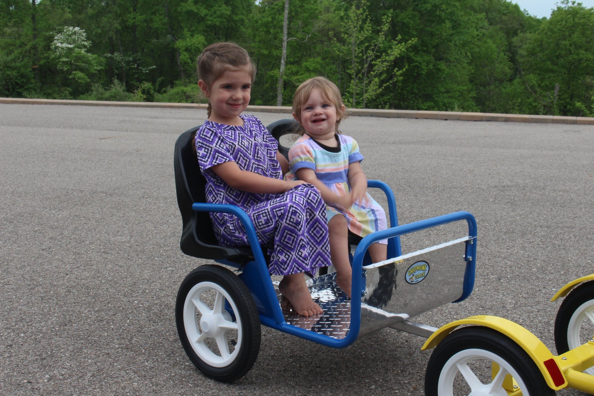 Amish-made "Chipmunk Coach" deluxe pull-behind trailer. Give your kids the ride of a lifetime with this unique pull-behind trailer. It is perfect for pulling behind a lawn tractor or ATV to give your kids the ultimate riding experience. It also pairs great with our Chopper Trike. It has a rear hitch to make a 'train' and give multiple rides at the same time. Features comfortable seats and easy-entry. The Chipmunk Coach is made by our Amish friends in Lancaster County, PA. Each seat measures 12" wide by 7" deep. The leg room area measures 12" from the front of the seats to the front of the coach. The overall measurements are 32" L x 24" W x 25" H. Powder-coated finish. Minor assembly is required.